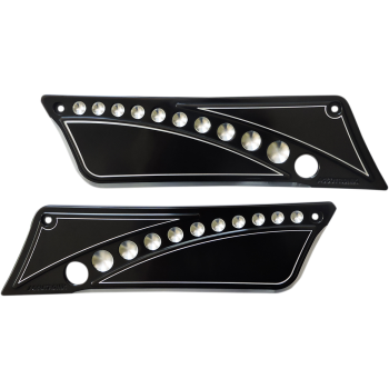 We have at your disposition four designs: milled, drilled, slotted and elite - available in shorty, standard, or extended lengths. You get your choice of matching “Show” pegs or our NEW rubber “Rider” pegs, and folding pegs are also available. Whatever your choice, we have matching rear pegs to complement our forward controls. And after you have chosen your forward control, finish up with the complete Accutronix line of covers and grips to match the unique crown of our pegs and end caps.